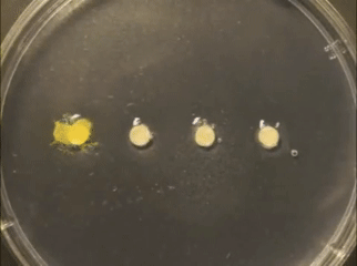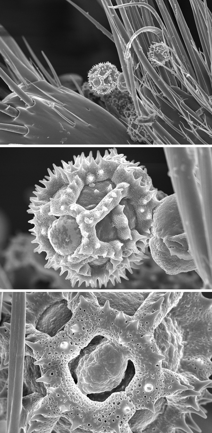 ▼高倍顯微鏡下蜜蜂身上的花粉。