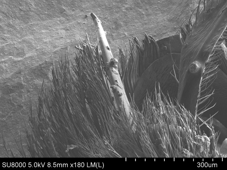 ▼高倍顯微鏡下蜜蜂的毒刺。