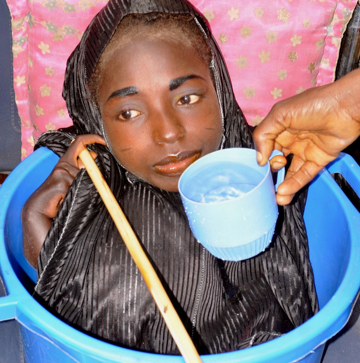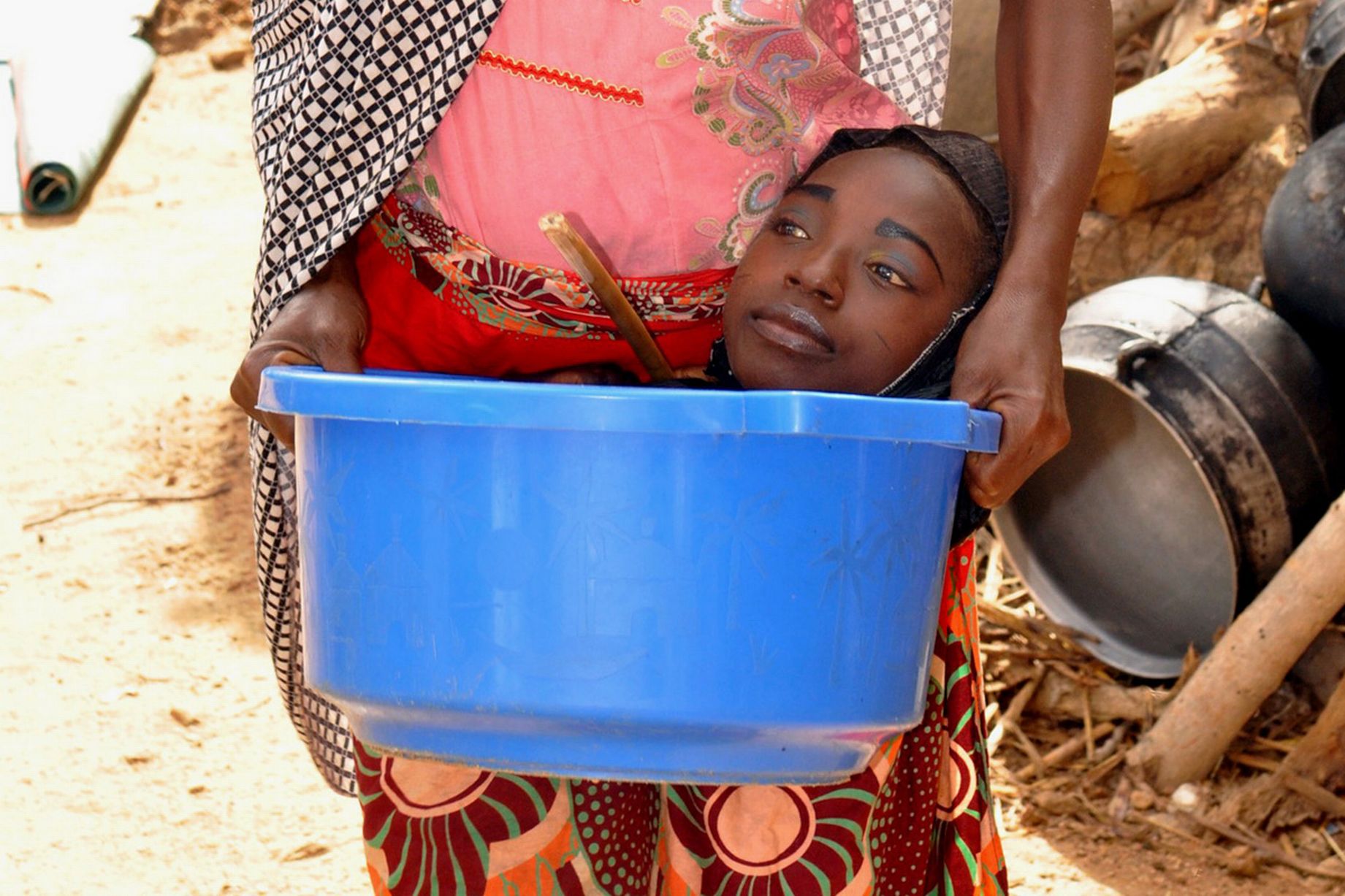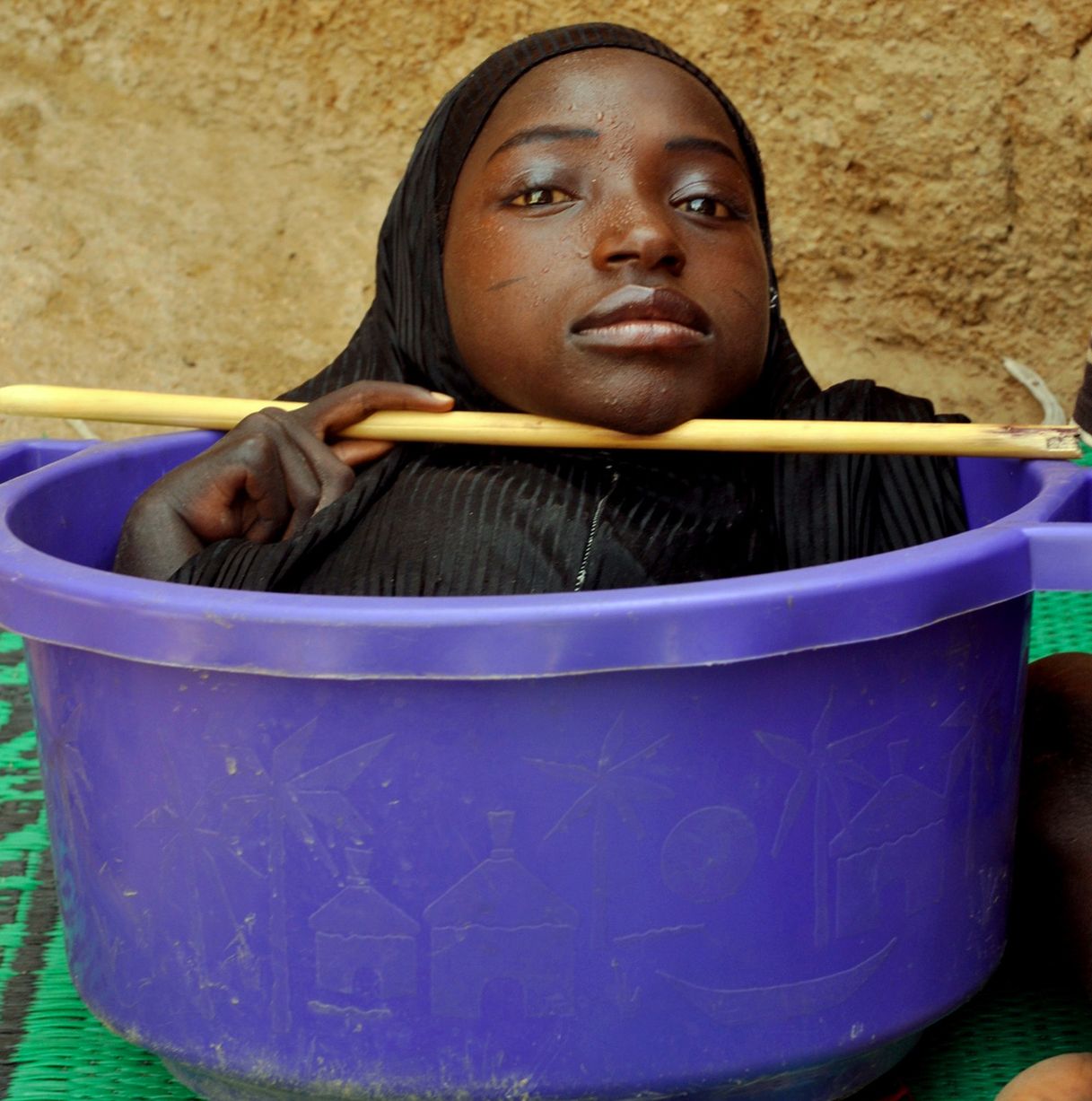 ▼為了方便帶著她行動,於是家人將她放在臉盆當中,讓她得到了「臉盆少女」的稱號。雖然拉瑪的父親努力工作賺錢,卻因為這件事花掉了所有積蓄,而女兒的狀況也沒有絲毫改變。