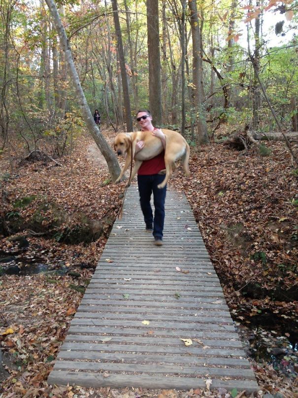 ▼狗狗不敢過橋,主人只能抱牠啦。