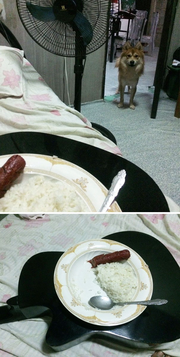 ▼狗狗害怕吉他,所以吃飯的時候用吉他護法就好啦。