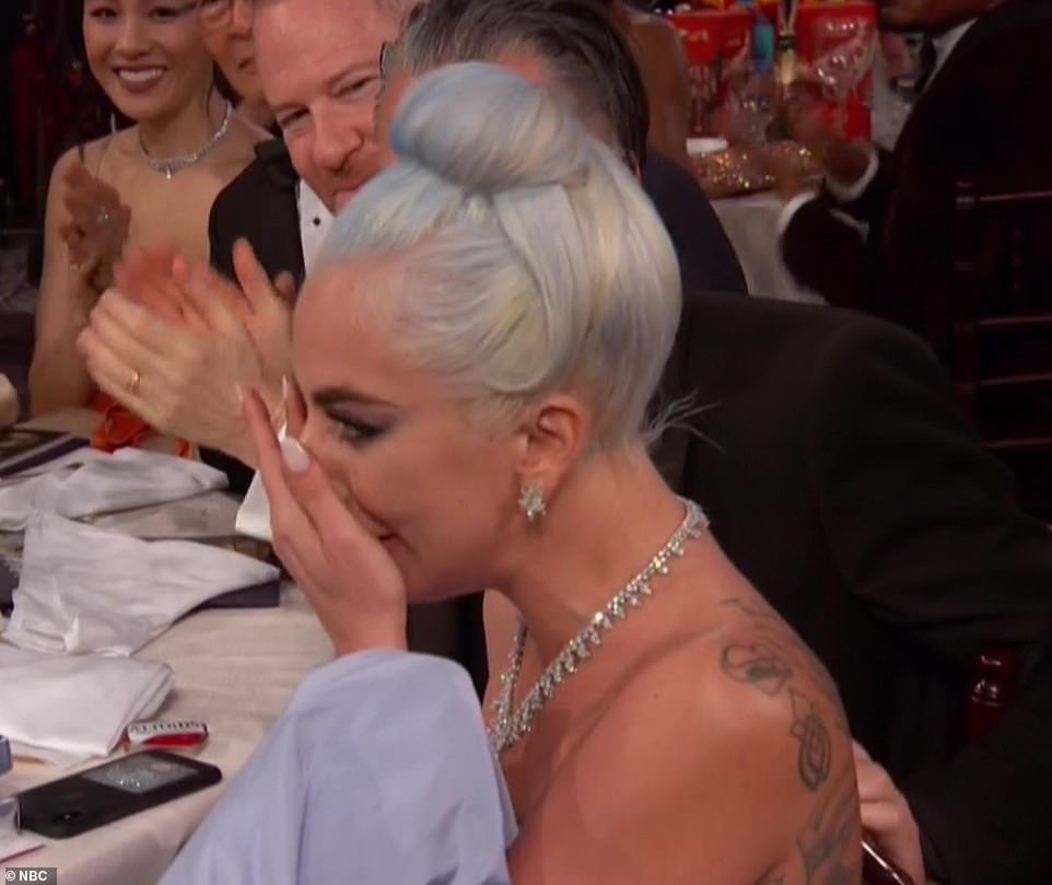 ▼在台下聽到「Shallow」獲獎時,女神卡卡激動地不停擦眼淚。