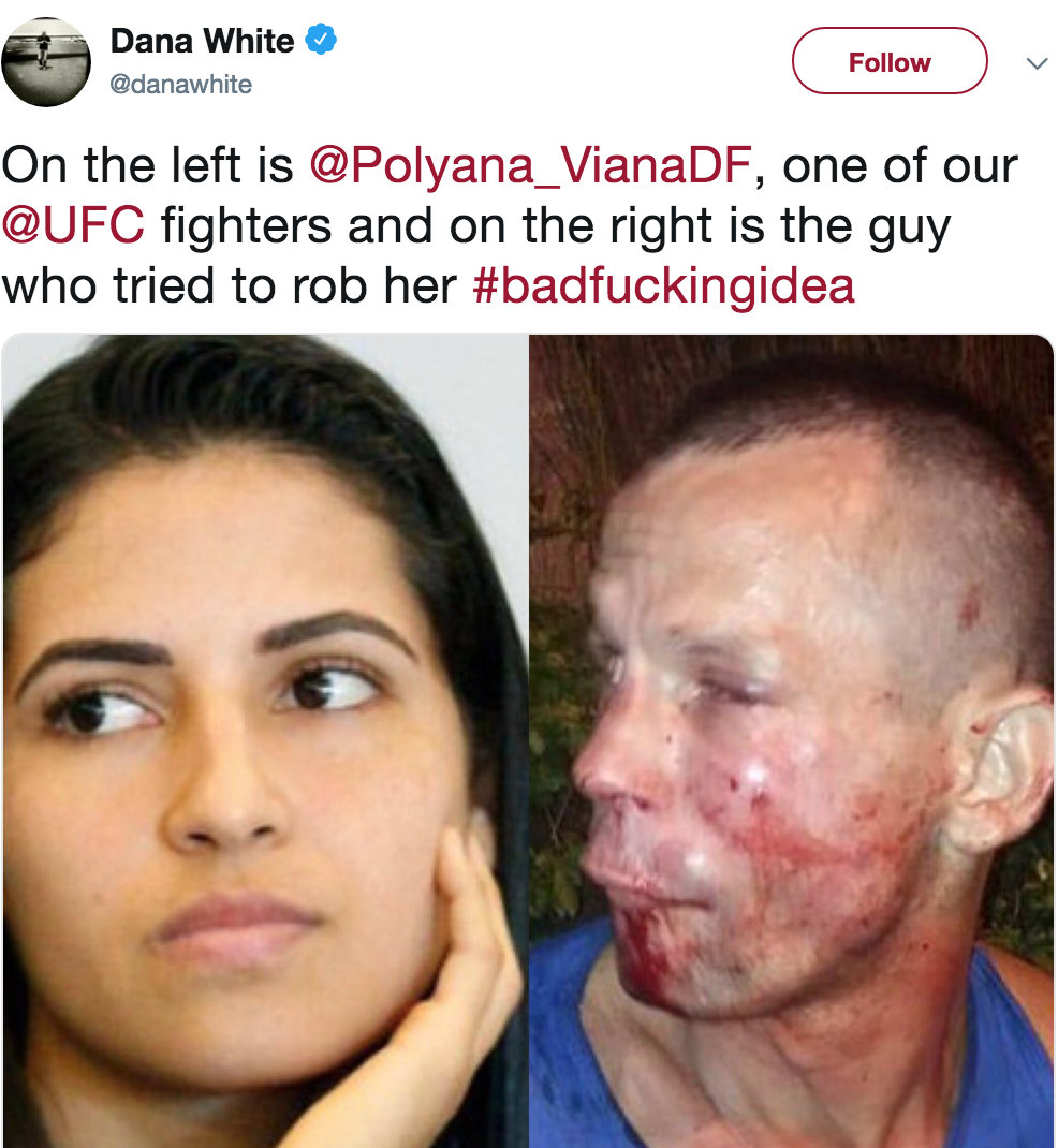 ▼劫匪沒想到Polyana戰鬥力這麼強,不停求饒,還說自己只是想問時間而已。Polyana當然不會放他走,劫匪被打怕了,哀求她趕快報警。1月7日,UFC總裁Dana White在社群網站上分享了這件事,還說搶到Polyana頭上是個糟糕的主意。