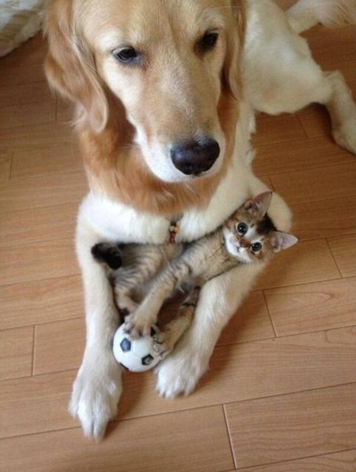 ▼1.可愛的小貓窩在狗保姆的臂彎,不仔細看還以為是個娃娃呢!