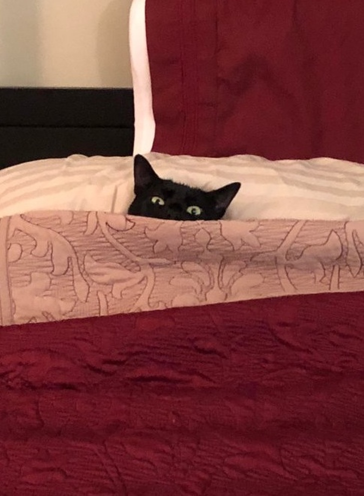 ▼4.飼主表示正打算鋪床睡覺,卻發現這個小傢伙竟然藏在床上