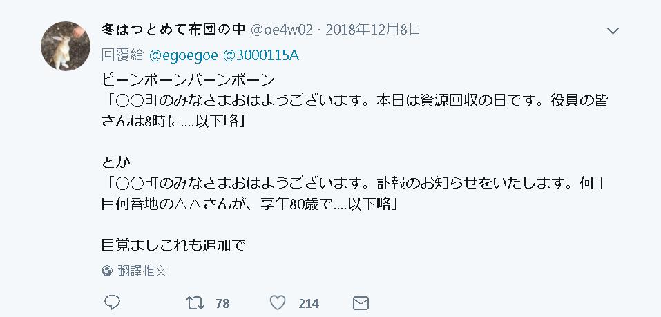 ▼「早上還有廣播,叮咚叮咚~『大家早安,今天是資源回收日,請大家早上8點…』或是『大家早安,訃報通知。X丁目X番地的XXX,享年80歲…』」