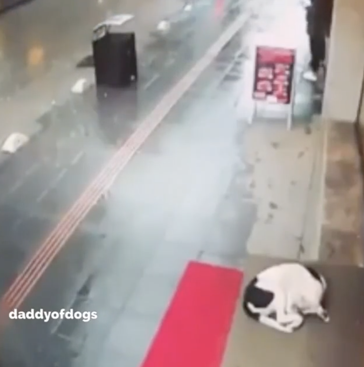 ▼路上一支白底黑色花紋的流浪狗,在濕冷的寒冬裡,為了暖和自己,便跑到了商店前,將身體捲曲起來休息。