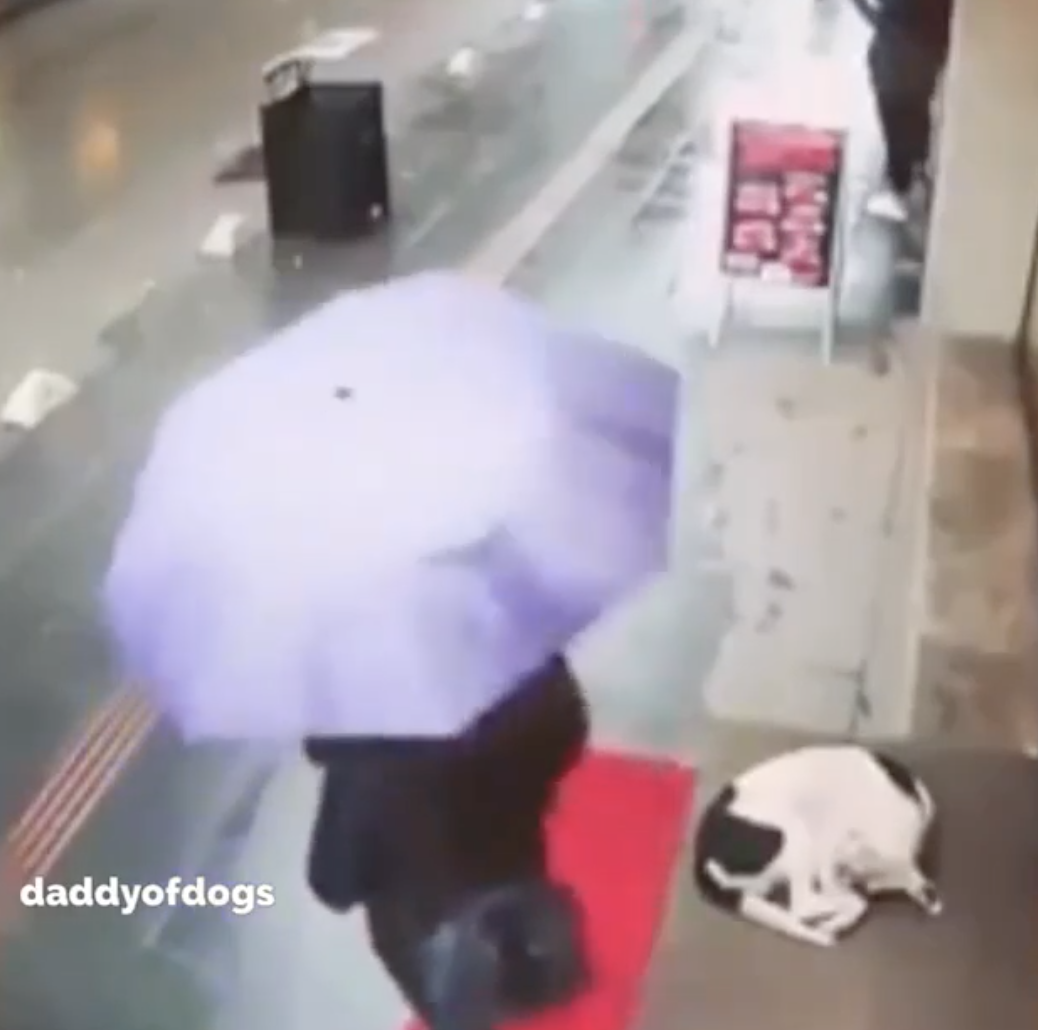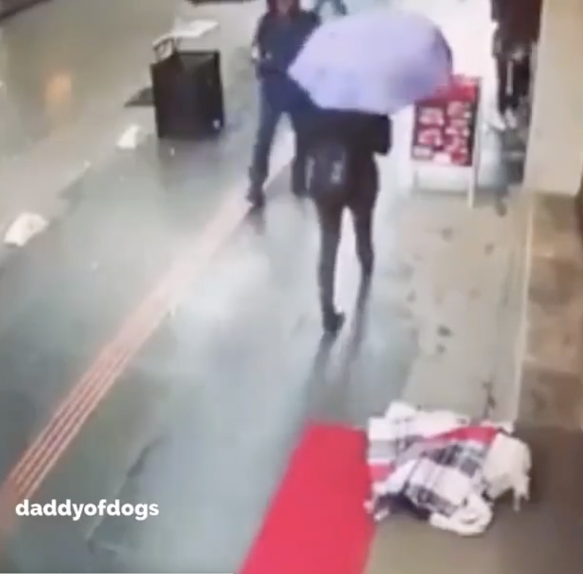 ▼替浪浪蓋好圍巾之後,就撐著紫色雨傘離去,愛心爆棚的舉動被監視器錄下,短短二十秒影片吸引大批網友討論。