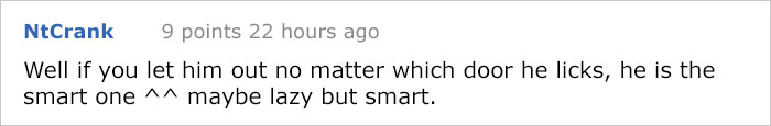 也許狗狗不是笨,只是偷懶而已。不需要走到前門那裡,隨便舔一扇門主人都會帶牠出去,牠根本超聰明好嗎?這樣看來,主人反而是被訓練的最好的那個啊……