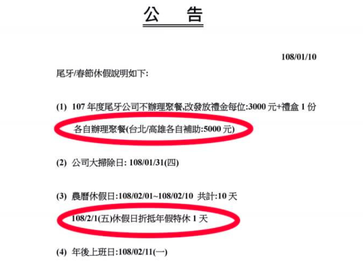 ▼一名網友在臉書社團「爆廢公社」po出公司公告,因為跨年時公司已經送員工去日本旅遊,所以今年不舉辦尾牙,一人補助3千元現金還有人蔘雞湯。不僅如此,老闆的老公還自掏腰包,個別再贊助台北跟高雄各5000元的聚餐費用。