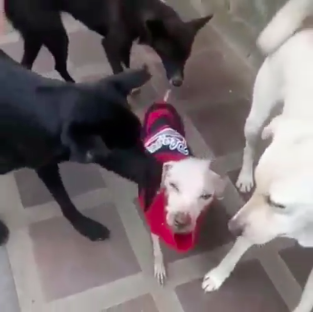 ▼影片一開始,這隻白色狗狗正在馬路中央埋頭進食。牠瘦得只剩皮和骨頭,身上的毛髒兮兮的,而且打結亂成一團,看起來很可憐。動保團體的志工將牠抱起,帶到收容所照料。