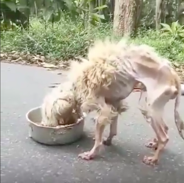▼志工們給牠東西吃,還給牠洗澡、剃毛。剃掉打結的毛髮後,牠看起來乾淨很多,但削瘦的模樣讓人更心疼了。每次吃飯,牠都很努力把碗中的食物吃光光,一點也不浪費。