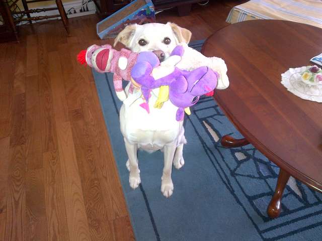 ▼凱拉表示 Atlas 出現這個動作大約是1歲半的時候,那時候每當有人到訪時牠都會非常興奮,會盡可能的咬住最多玩具跑出來迎接。