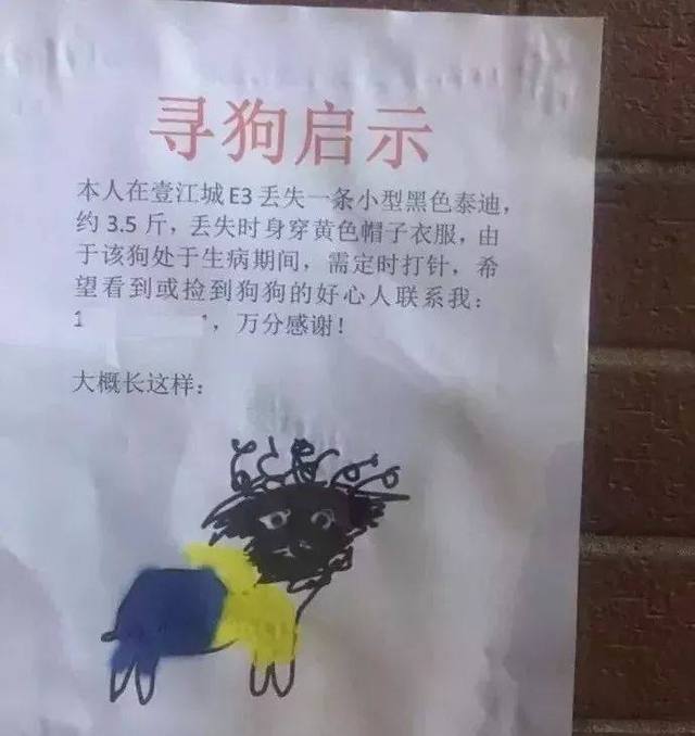 ▼一般情況下尋狗啟事上都會放一張狗狗的照片,而且是辨識度很高的,但是這張尋狗啟事上卻是主人手繪的狗狗,不僅看不出狗狗的模樣,連品種都看不出來。