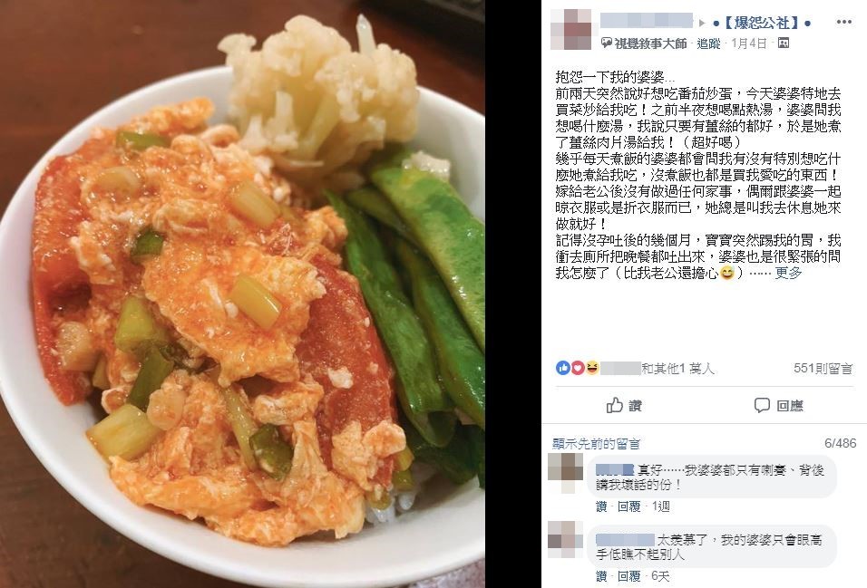 2019年01月15日提起婆媳關係,很多人會忍不住皺眉,其實也有很多家庭婆媳非常和睦。台北市一名女網友在臉書「爆怨公社」po文說,婆婆很寵她,她想吃番茄炒蛋,婆婆就專門買菜做給她吃,就連她半夜想喝熱湯,婆婆也會很用心做。