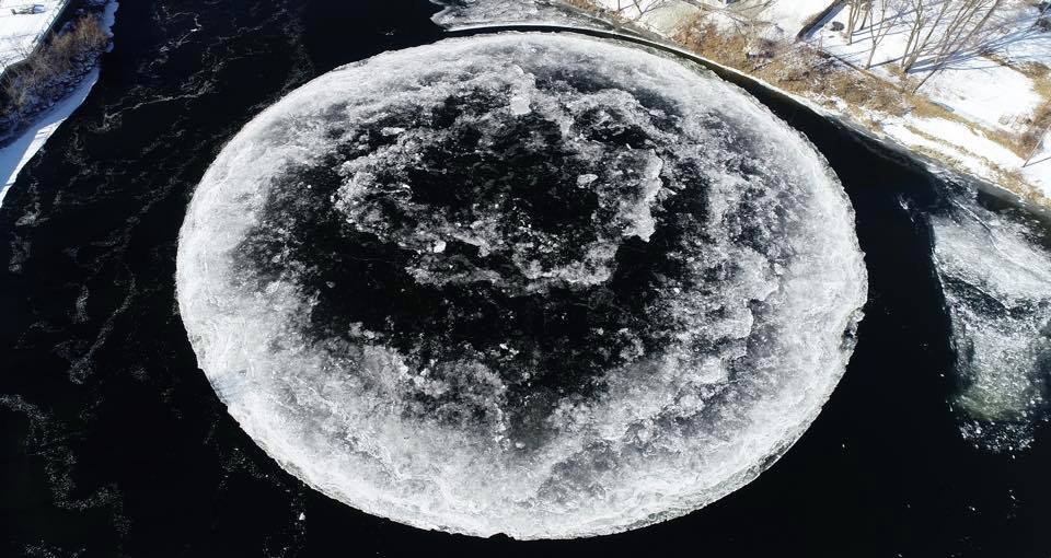 ▼冰盤位於韋斯保克市的普利桑普斯科特河(Presumpscot River)河面,直徑約91米。美麗的花紋更增添了逼真度,從空中俯瞰就猶如漂浮在銀河中的月球一般,更神奇的是,冰盤還隨著水流不斷旋轉,有網友開玩笑說,是外星人的飛碟降落在了河面上。