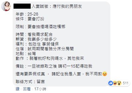 ▼此外最令網友瘋狂的就是以下的這些「額外福利」:「住宿:家、飯店 看臉分床分房間;地點:嘉義;動作:最多就抱抱,帥的話可以做;備註: 一旦被錄取之後,請一定要陪我走完這幾天,我總不可能今天跟明天的男友帶完全不一樣的吧,還有要弄假成真,請記住我不美別抱遐想;聯絡: 留言」。