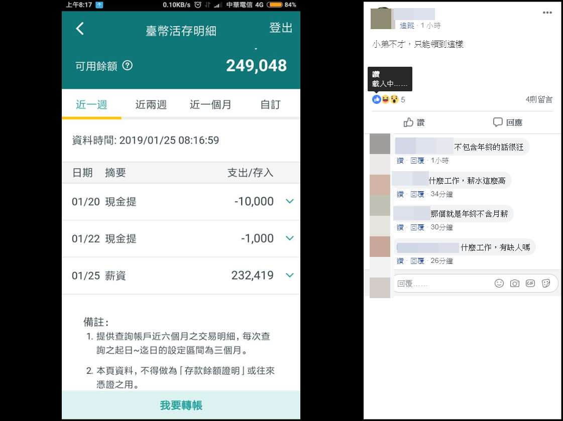 2019年01月26日又到了領年終的時候!一名男網友在臉書社團「爆廢公社」po出一張戶頭轉帳紀錄截圖,表示:「忍了這麼久就是等這幾萬塊,年終樓蓋起來!」從截圖中可以看到,他的戶頭中多了一筆51183元的年終。還有人注意到,他的存款餘額有60多萬,網友們大呼羨慕。