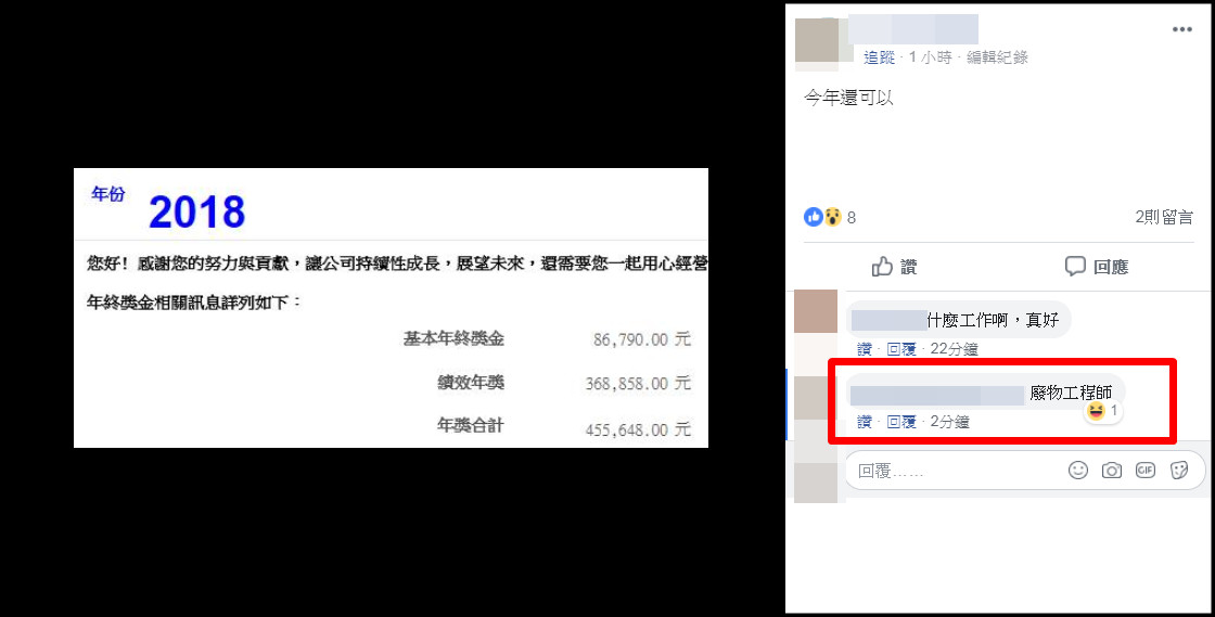 ▼一名工程師隨後po出公司的公告截圖,上面寫著:「您好,感謝您的努力與貢獻,讓公司持續性成長,展望未來,還需要您一起用心經營。」公告下方還有他工作一整年能夠領到的錢,包括基本年終獎金86790元、績效年獎368858元,年獎合計455648元。他非常淡定,只是說:「今年還可以。」網友們忍不住問:「什麼工作啊,真好。」他回答:「廢物工程師。」