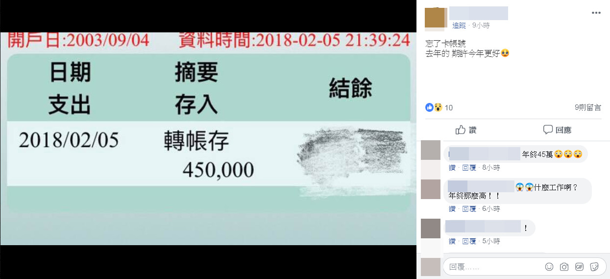 ▼其他網友也紛紛曬出自己的年終和存款。這位網友去年拿了45萬。