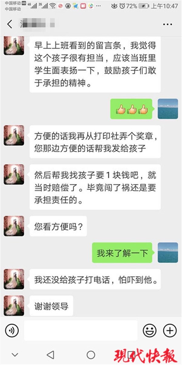 ▼車主看到這張紙條後非常感動,也因為顧慮孩子的感受沒有直接打電話,而他剛好認識東風小學的校長,於是希望朋友能夠協助找到這位「肇事者」。車主在對話中向校長表示:「我覺得這個孩子很有擔當,應該在班上表揚一下,鼓勵孩子們敢於承擔的精神。」也表示自己還是會向她索賠「1元人民幣」,畢竟要學著承擔責任,但透露之後會印獎章,肯定女孩的勇氣。
