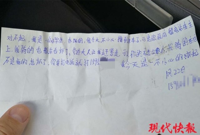 「對不起,我是一名小學生,東風的,我今天不小心撞到你車了,可是你沒有留電話在車上,我騎的電瓶車也壞了,旁邊大人讓我趕緊走,可是你的車怎麼辦?我騎的車也不是我的,也壞了。你要打電話就打 1595 XXXXXX,我今天是不小心的,對不起。」