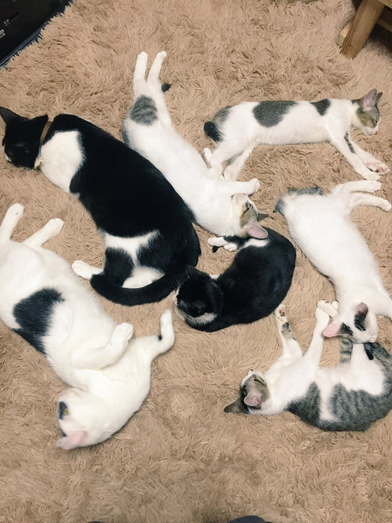哈哈哈,貓大大各各都睡得東歪西倒,不知道的人分分鐘還以為是集體嗑藥暈倒了,整個看起來像「案發現場」這樣壯觀耶!(咦?)現在可憐的原Po想要塞進電毯取暖都已經沒有空間了,看來貓奴也只能認命,乖乖把自己的冬天取暖聖品上繳給貓大大使用啦!