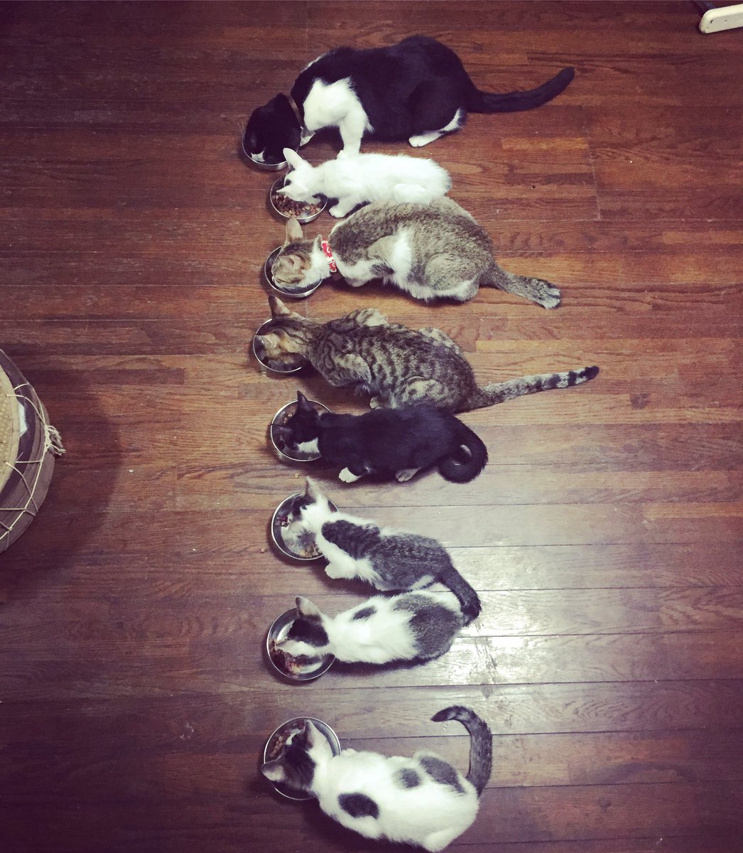 ▼睡飽之後就起床開始叫貓奴給罐罐吃,這些貓咪真是幸福啊!(話說,貓咪集體開飯的畫面也很超療癒der..笑)