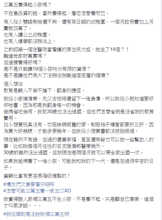原po之所以會寫這篇文章,其實是因為看了一篇抱怨文,指那些三萬五不生小孩還怪政府的人,其實是自私不想犧牲自己生活品質才不生,不要牽拖政府、牽拖低薪,讓他很有感觸,於是才分享了自身的經歷。因為在薪水太低的情況下,不僅生活品質受限,而且教育是非常花錢的,孩子的許多機會也被剝奪了,能夠成功出人頭地的又有多少人呢?「可以養活小孩,不等於可以養好小孩」這句話,真是一句無情卻又現實的名言,不知大家是否能夠認同這些觀點呢?