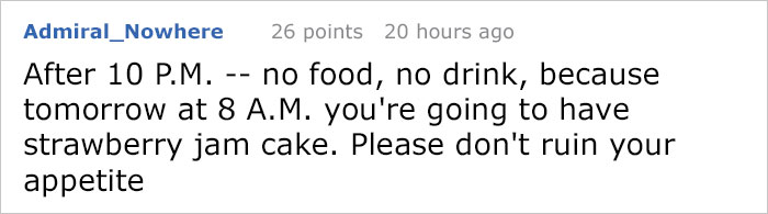 ▼「今晚10點後不提供食物,也不提供水,因為明早8點你會吃到草莓果醬蛋糕。」