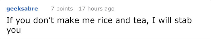 ▼「如果你不準備好米飯和茶,我會用刀好好教訓你。」