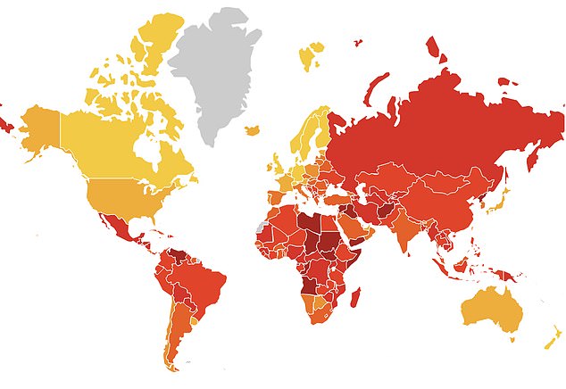 ▼以下這個世界地圖中,顏色越淺(黃色)代表越廉潔,而顏色越深(紅色)則代表狀況越嚴重。