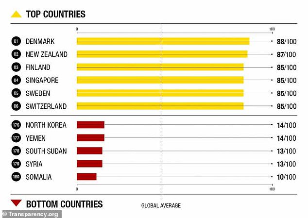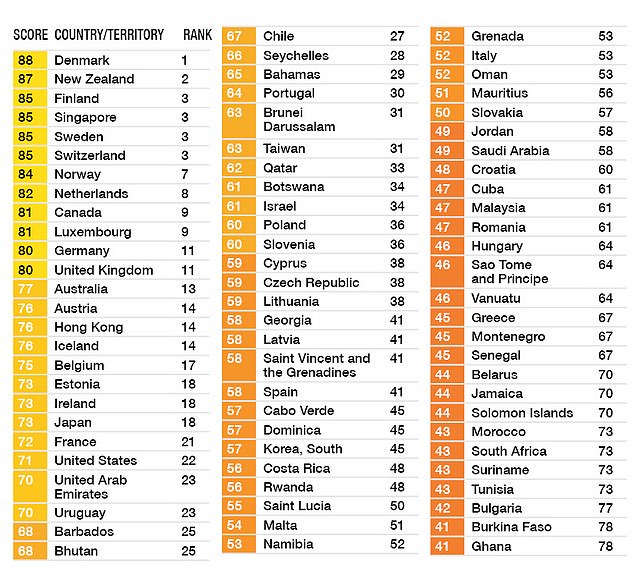 ▼從以下這個表中可以看到,名列前茅的丹麥、紐西蘭、芬蘭、新加坡、瑞典、瑞士,和「吊車尾」的索馬利亞、敘利亞、南蘇丹、葉門和北韓分數差距有多麼巨大!