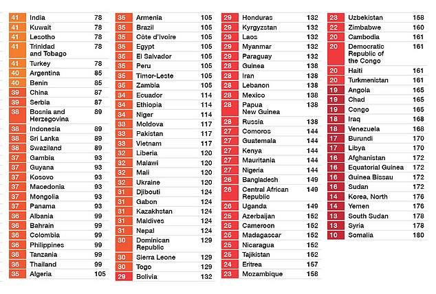 ▼至於名單的另一端,排在墊底的國家是索馬利亞、其他幾個分數接近的國家有:敘利亞、南蘇丹、葉門和北韓。與台灣地理位置接近的中國則排在第87名。
