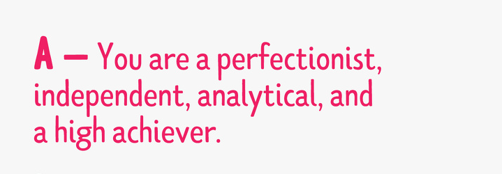 ▼A:你是一個完美主義者,非常獨立且很會分析問題。你對自我要求非常高。