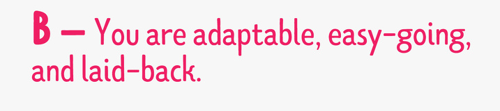 ▼B:你很容易適應新環境、非常好相處、喜歡讓自己放鬆。