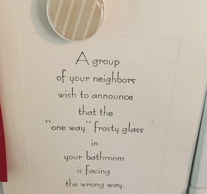 ▼鄰居留下了一張字條:「你的鄰居想要告訴你,你們浴室的單向霧面玻璃裝反了。」