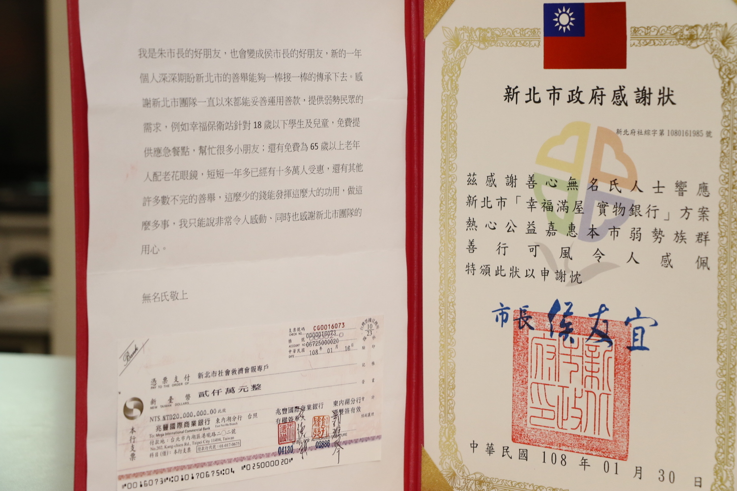 ▼他附上的A4紙只寫了簡短的幾句話「我是前新北市朱市長的好朋友,也會變成侯市長的好朋友,新的一年,個人深深期盼新北市的善舉能夠一棒接一棒的傳承下去…」神秘大善人從8年前朱立倫還是市長時就固定捐款,第一年是1千萬元,接著每年都捐贈2千萬。