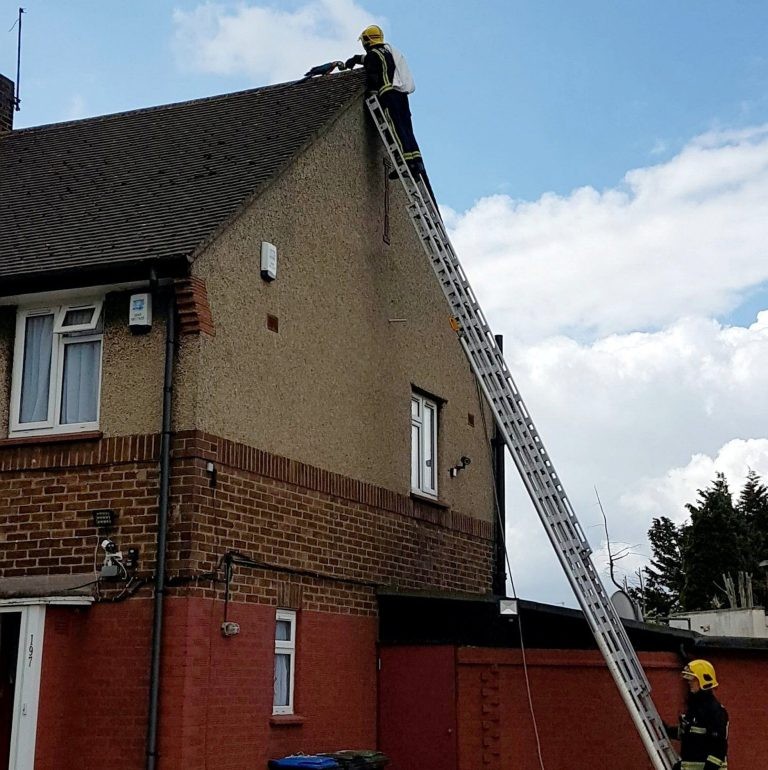 ▼這下主人著急了,他怕Jessie發生危險,就請消防員來幫忙。消防員爬上長長的梯子前,主人不停說Jessie很乖:「你只要跟牠說『我愛你』,牠就會乖乖聽話的。」最了解寵物的肯定是主人,所以消防員沒有懷疑,乾脆利落爬上了屋頂。