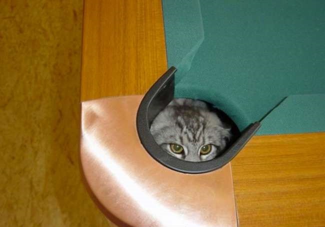 ▼你是不會想到,貓咪竟然可以縮成撞球洞那麼小。