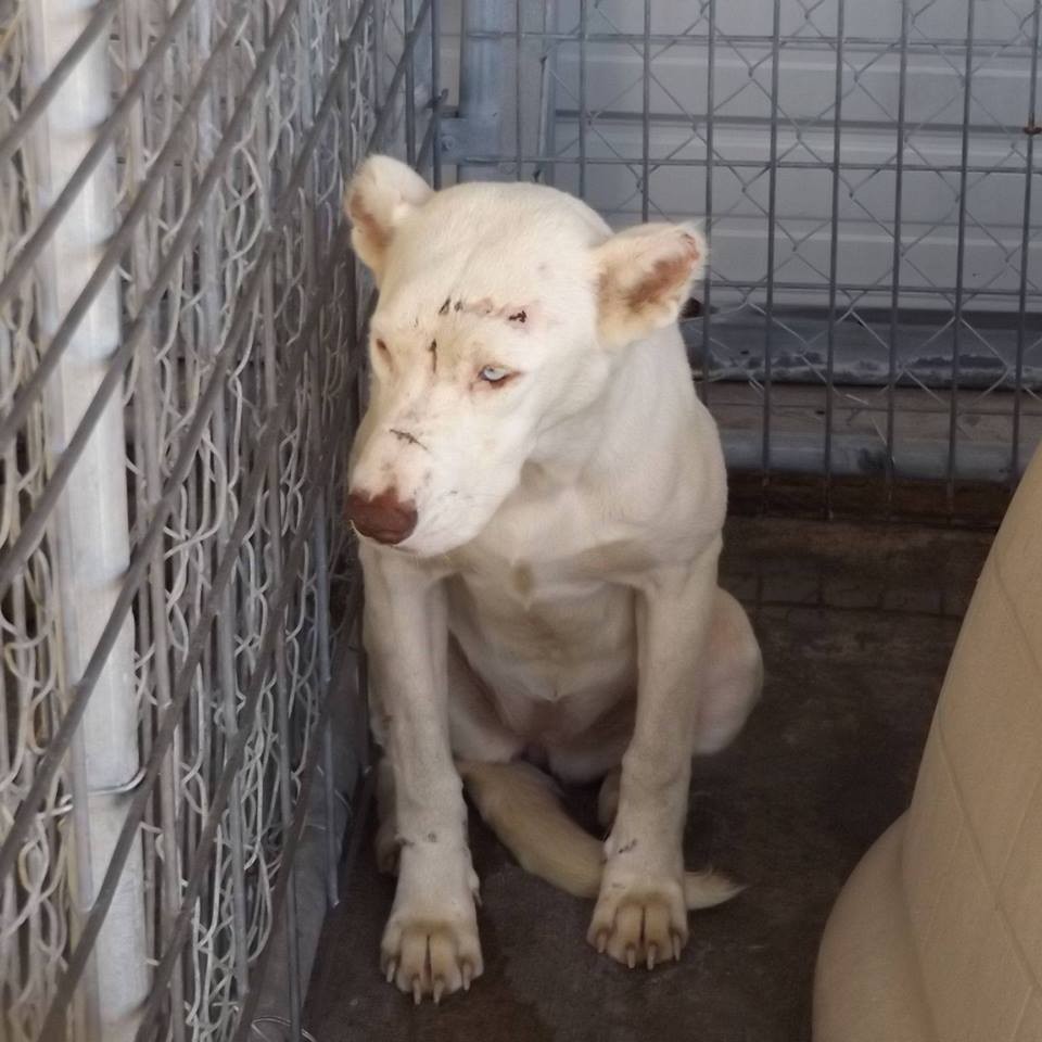 ▼Niya被前主人遺棄,非常膽小,待在籠子的角落,甚至不敢與人有眼神接觸。牠的眼睛上方有一道疤痕,可能是被人用工具打的,鼻子附近的疤則可能是被人用口罩綁住留下的痕跡。種種跡象表明,這個可憐的小傢伙曾經被人狠狠傷害過。