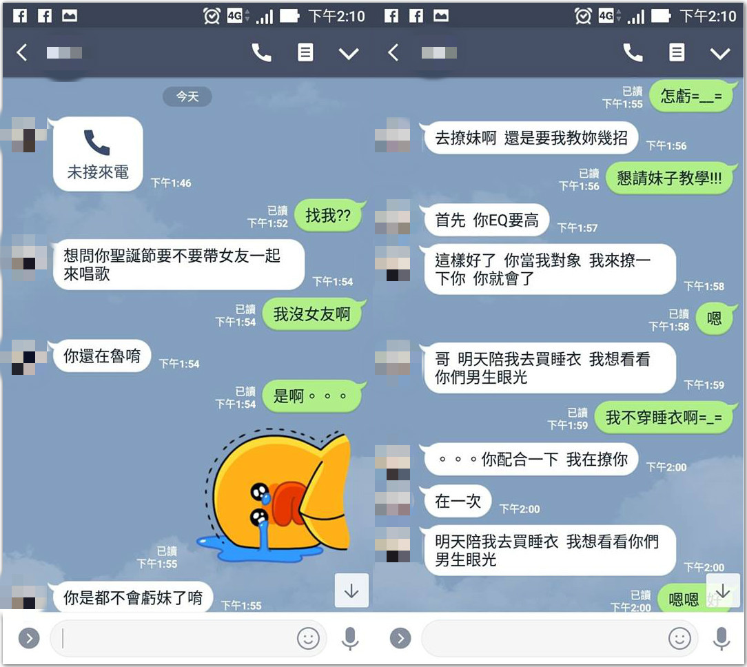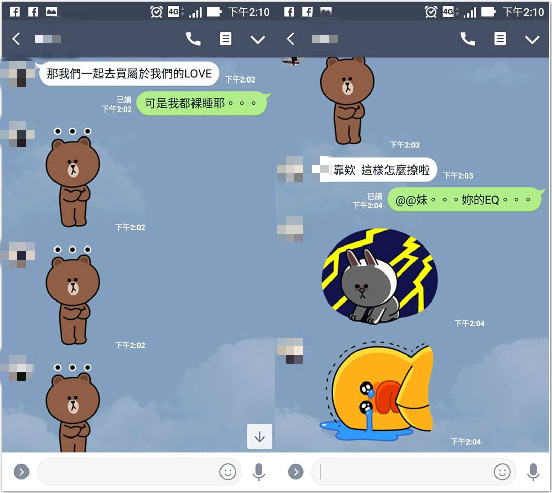 ▼女方很無奈,要他配合一下「我在撩你」,又傳來情境說:「那我們一起去買屬於我們的LOVE。」這位男網友又誠實說:「可是我都裸睡耶…」女性友人連續傳了好幾個無言的貼圖,崩潰說:「靠欸!這樣怎麼撩啦!」他還沒開竅,說:「妹…妳的EQ…」