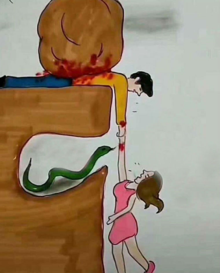 ▼女人覺得:「我快要墜崖了!有一條蛇在咬我,我沒辦法爬上去!為什麼他不能用點力氣,把我拉上去呢?!」