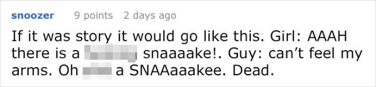 ▼「故事應該是這樣的。女生:啊啊啊,TMD有蛇啊! 男生:我的手臂沒感覺了,TMD!真的有蛇! 然後他們都掛了。」