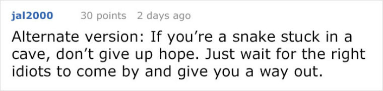 ▼「換個角度看:如果你是一條被困在洞中的蛇,不要放棄希望,總會有命中注定的笨蛋來救你出去。」