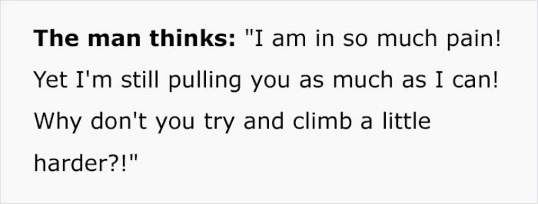 ▼男人覺得:「我真的好痛,但還是竭盡全力拉著妳,妳為什麼不能再努力一點往上爬呢?!」