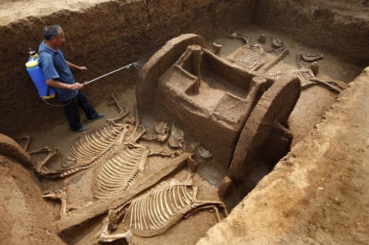 考古學家認為,這個墓穴屬於周朝的一個貴族家庭,當地挖出了數十輛戰車還有近100馬匹,距今已有2400年歷史。最重大的發現是一輛長2.4米,寬約1.7米的戰車,上面裝飾著青銅和骨頭。