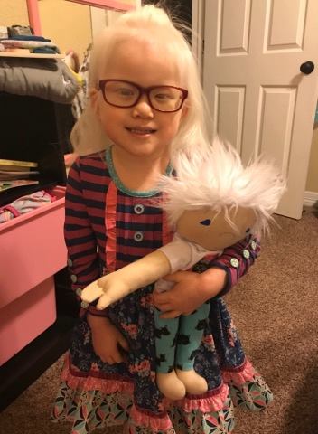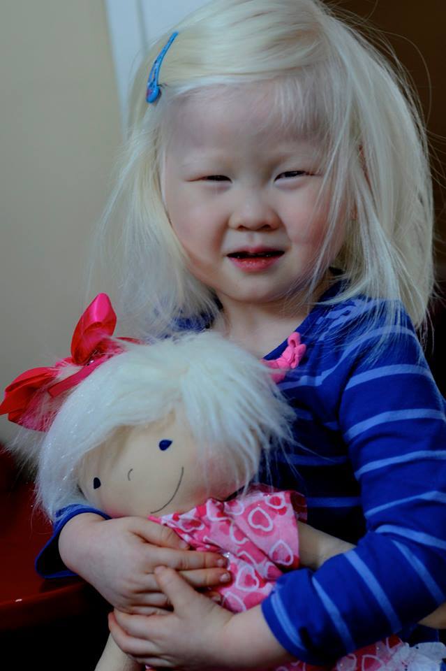 ▼這個娃娃和白化症女孩同樣有一頭白髮!