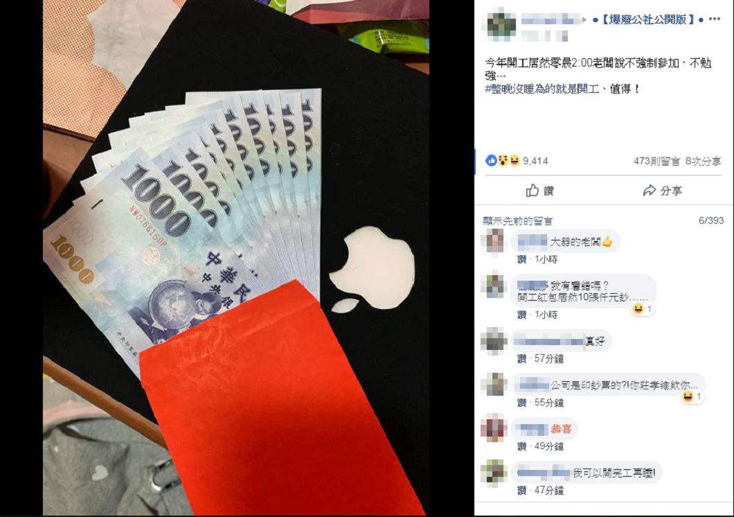2019年02月11日農曆春節年假已經結束啦,大多數公司會選在初五或初六開工,老闆為了討吉利,也會發「開工紅包」。一名女網友在臉書社團「爆廢公社公開版」發文稱,公司選在「凌晨2點」開工,她熬夜出席竟然拿到了超大包。