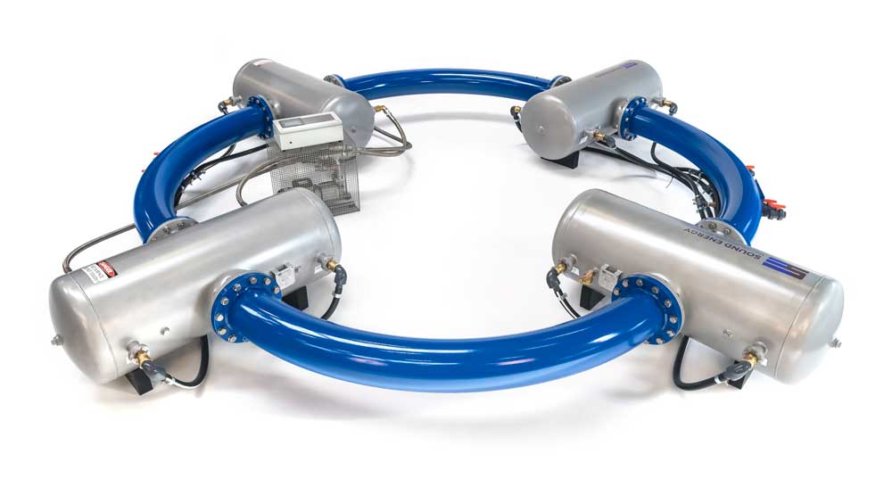▼「THEAC-25 系統」以氬氣作為工作氣體,裝置吸收熱量後產生聲波,接著聲波經過藍色環狀管做加壓循環,一直增強到氬氣產生溫度梯度,就可以轉化出冷空氣了。整個過程沒有用到任何機械運動元件,也不需要額外電力,只要準備100%的工業廢熱或太陽熱能就可以了。